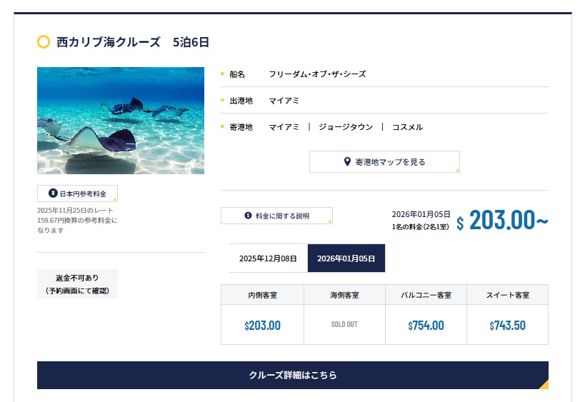 サイトを見たところ、残念ながら203ドルのお部屋は売り切れてしまっているようですが、クルーズはこのような価格で行くことができるんです。